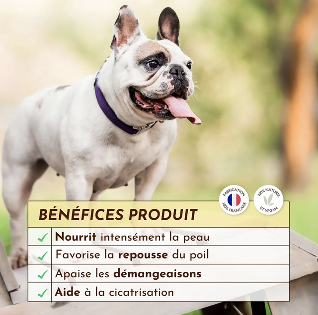 100% naturel il apaise, répare, soigne, nourrit et est adapté aux parties sensibles (visage, yeux, oreilles, museau et parties génitales)