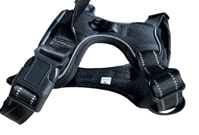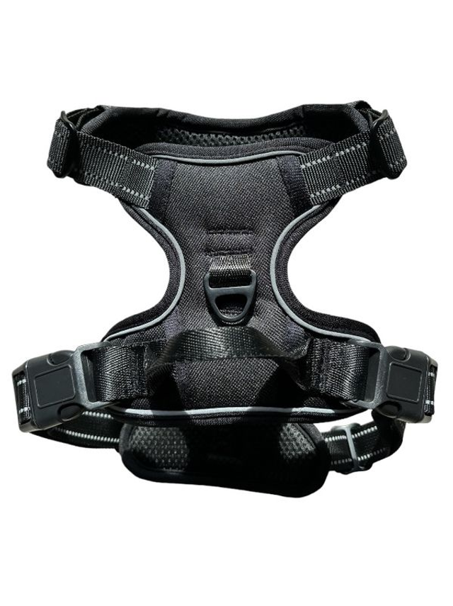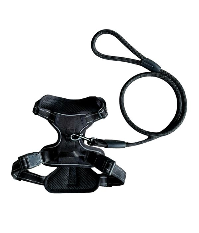 Harnais noir adapté à toutes les morphologies, protège les articulations et très confortable pour les chiots qui apprennent la marche en laisse